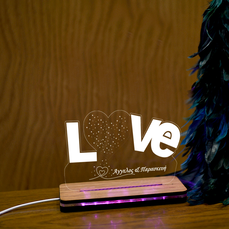 Απόκτησε αυτό το ξύλινο προσωποποιημένο φωτιστικό Led με χάραξη σε πλέξιγκλας. Το φωτιστικό είναι χαμηλής κατανάλωσης, με 7 διαφορετικά χρώματα φωτισμού και έχεις τη δυνατότητα να χαράξεις σε αυτό το μήνυμα ή το όνομα που επιθυμείς. Χρησιμοποίησέ το ως φωτιστικό κομοδίνου στην κρεβατοκάμαρα, ή το παιδικό δωμάτιο, και δημιούργησε την πιο όμορφη ατμόσφαιρα χάρη στο ροοστάτη. Με τη βοήθεια του dimmer μπορείς να προσαρμόσεις την ένταση φωτισμού και να απολαύσεις μια άνετη και χαλαρή ατμόσφαιρα.