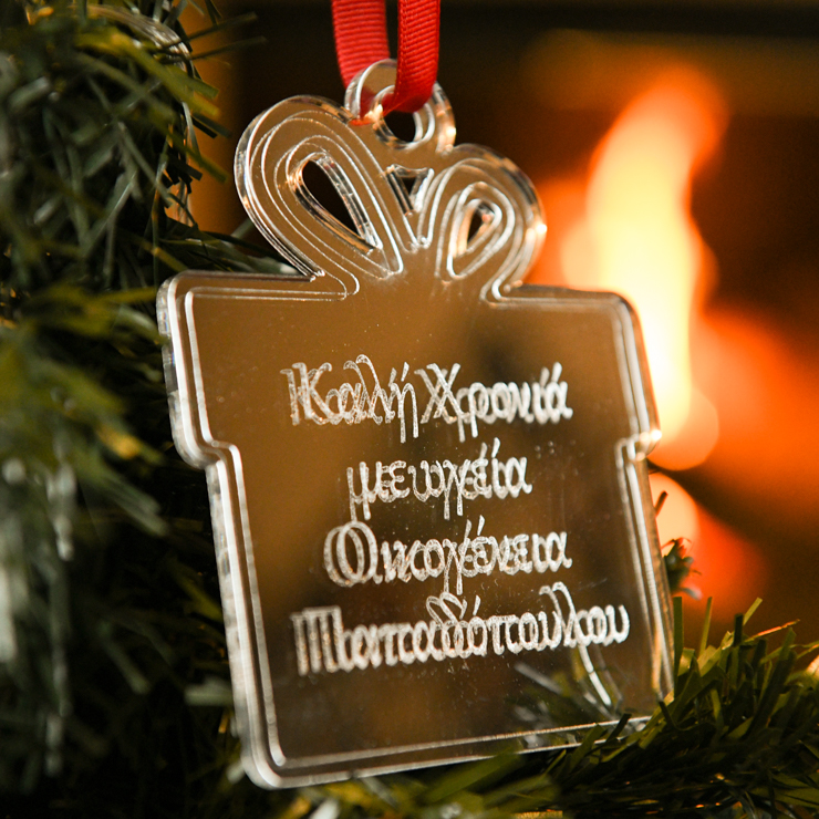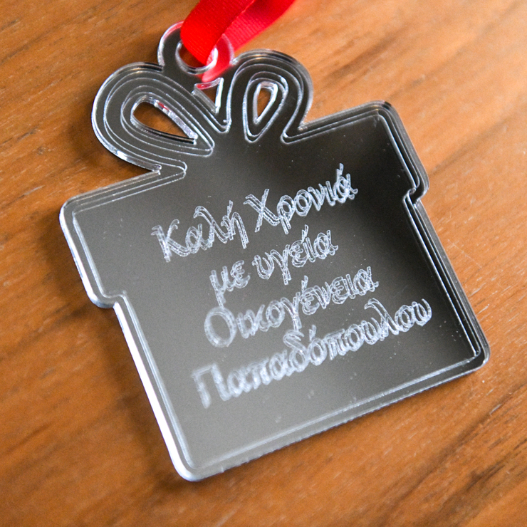 Μοναδικό στολίδι σε σχήμα δώρου , σε ασημένιο καθρέφτη plexiglass.