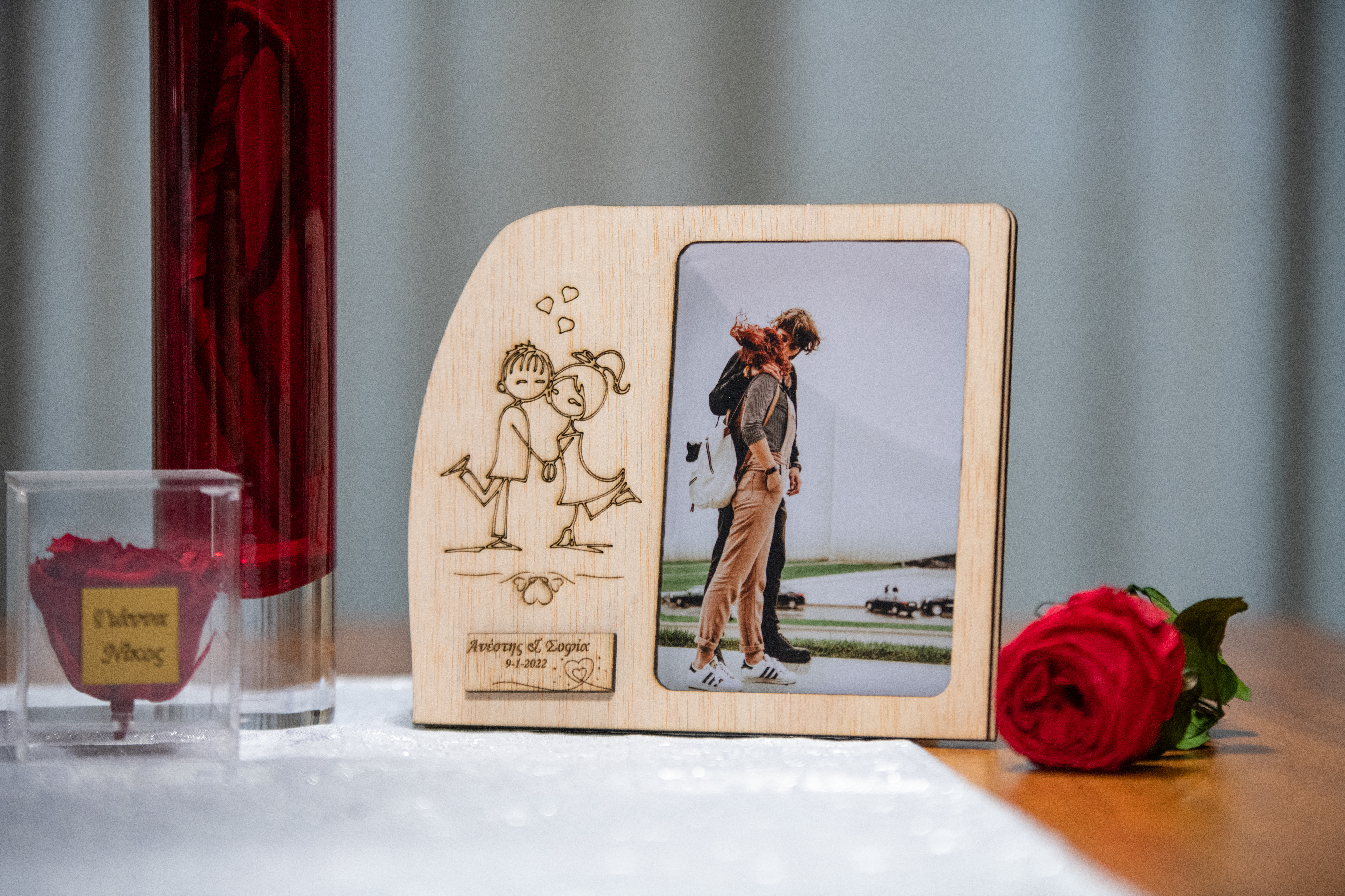 Κάνε το πιο ρομαντικό δώρο: μία μοναδική επιτραπέζια ξύλινη κορνίζα με τη φωτογραφία και τα ονόματά σας. Κομψή, μοντέρνα, πρωτότυπη και σκαλιστή με laser, η κορνίζα αυτή θα διακοσμήσει το σαλόνι, το υπνοδωμάτιο ή την είσοδο με τις αγαπημένες σας στιγμές! Πρόσθεσε τη φωτογραφία που επιθυμείς και τα ονόματά σας ή το μήνυμά σου και δημιούργησε το καλύτερο προσωποποιημένο δώρο για επέτειο, γενέθλια και την ημέρα του Αγίου Βαλεντίνου.